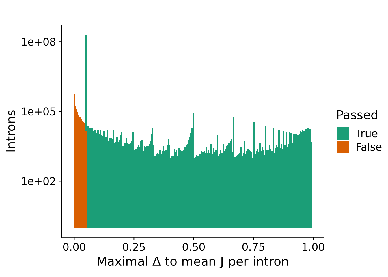 The variability filtering step removes introns that have no or little variability in the splice metric values across samples. The requirement for an intron to pass this filter is: